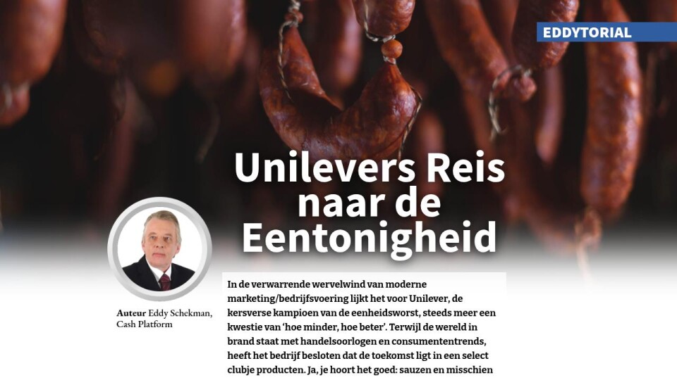 In de verwarrende wervelwind van moderne marketing/bedrijfsvoering lijkt het voor Unilever, de kersverse kampioen van de eenheidsworst, steeds meer een kwestie van ‘hoe minder, hoe beter’. Terwijl de wereld in brand staat met handelsoorlogen en consumententrends, heeft het bedrijf besloten dat de toekomst ligt in een select clubje producten. Ja, je hoort het goed: sauzen en misschien zelfs die oh-zo-iconische Unox-worst. Want wie heeft er nu nog behoefte aan variëteit als je ook met één product kunt schitteren?