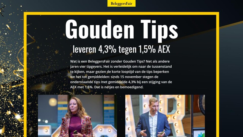 Wat is een BeleggersFair zonder Gouden Tips? Net als andere jaren vier tipgevers. Het is verleidelijk om naar de tussenstand te kijken, maar gezien de korte looptijd van de tips beperken we het tot gemiddelden: sinds 15 november stegen de onderstaande tips met gemiddelde 4,3% bij een stijging van de AEX met 1,5%. Dat is netjes en bemoedigend.