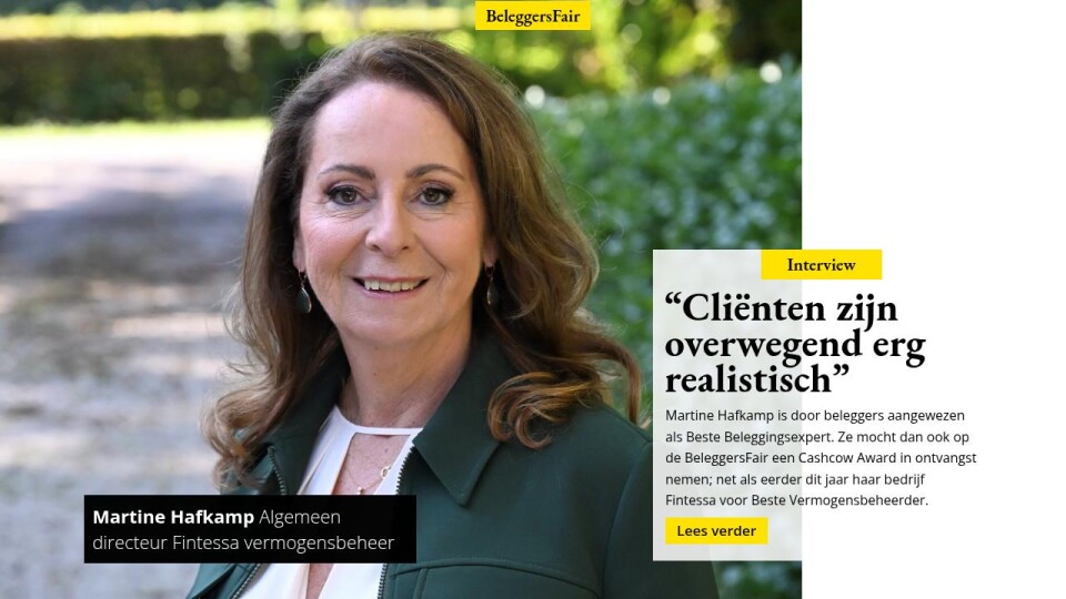 “Die zijn over het algemeen prima, afgezet tegen de diverse indices. Ons beleggingsbeleid is er in eerste instantie op gericht om te outperformen in mindere jaren. Dat betekent het voorkomen van grote verliezen, want terugverdienen wordt moeilijker naarmate het verlies groter is. Als dat lukt ben je al een heel eind. Maar ook in goede jaren (de afgelopen twee jaar) was de performance heel goed. Cliënten die al lang cliënt zijn realiseren de rendementen waar zij volgens hun beleggingsprofiel naar streven. Zo bedraagt het rendement op ons neutrale profiel over de afgelopen tien jaar gemiddeld 6,4 procent per jaar netto. Dat is zelfs iets meer dan wij vooraf aangeven. Het is dan ook niet zo verwonderlijk dat wij nog steeds groeien, ook veel via mond-tot-mond-reclame en je wordt als Fintessa niet voor niets de Beste Vermogensbeheerder en als Martine Hafkamp de Beste Beleggingsexpert toch?”